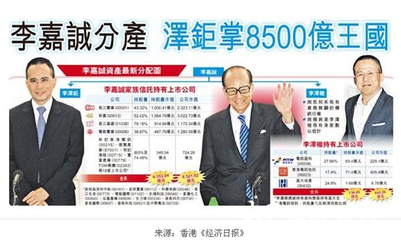 2012年5月,李嘉誠在出席旗下公司長江實(shí)業(yè)及和記黃埔股東大會后對外公布了家族資產(chǎn)分配計(jì)劃:將自己持有的超過四成的長江實(shí)業(yè)及和記黃埔股權(quán),以及約35.5%的赫斯基能源分配給長子李澤鉅,這一部分資產(chǎn)的市值約合2041億港元。而對于次子李澤楷,李嘉誠則稱將以現(xiàn)金方式全力幫助其收購心儀的目標(biāo)公司。