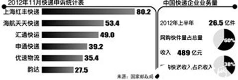 根據中國交通運輸協會快遞分會公布的數據,網購快遞每年以80%速度增長。2012年中國快遞企業(yè)業(yè)務量將達到48億件,收入有望首次超過1000億元人民幣。2012年上半年全國快遞業(yè)務收入489億元,快件量26.5億件,其中,網購快件量占到總快件量的60%左右,網購快遞收入占到快遞業(yè)務總收入38%。