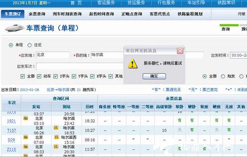 但隨后記者再次查詢北京前往哈爾濱、成都等熱門城市車票時發(fā)現(xiàn),網(wǎng)站彈出“服務(wù)器繁忙,請稍后重試”的提示,點擊“確定”后可繼續(xù)操作,暫不影響預(yù)訂車票。