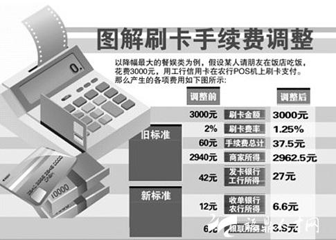 “我行將于2013年2月25日對(duì)‘商戶通’終端刷卡扣率進(jìn)行調(diào)整,為避免影響機(jī)具的正常使用,請(qǐng)配合我行上門人員做好補(bǔ)充協(xié)議的換簽工作。 ”昨天,收到建行安徽省分行送來(lái)的告知函,蕪湖路萬(wàn)達(dá)廣場(chǎng)的經(jīng)營(yíng)戶王先生很高興,“刷卡手續(xù)費(fèi)終于要降了。 ”據(jù)悉,按照央行要求,2013年2月25日起全面執(zhí)行新的《銀行卡刷卡手續(xù)費(fèi)標(biāo)準(zhǔn)》。餐飲類、一般類、民生類以及公益類,此次刷卡手續(xù)費(fèi)調(diào)整仍然實(shí)施行業(yè)差別化定價(jià),將行業(yè)分成四大類。其中,餐娛類(包括餐飲、賓館、娛樂、珠寶金飾、工藝美術(shù)品、房地產(chǎn)及汽車銷售)標(biāo)準(zhǔn)從原來(lái)的2%降至1.25%;一般類(百貨、批發(fā)、社會(huì)培訓(xùn)、中介服務(wù)等)標(biāo)準(zhǔn)由1%下調(diào)至0.78%;民生類(包括超市、大型倉(cāng)儲(chǔ)式賣場(chǎng)、加油、交通運(yùn)輸售票等)由原來(lái)的0.5%下調(diào)至0.38%。