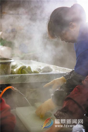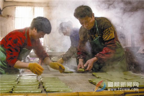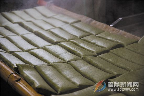 天蒙蒙亮的早晨六點,前岐一家鼠菊粿加工廠便忙碌起來。記者在現(xiàn)場看到,門前的兩個大木桶浸泡著一袋一袋備用的大米,一筐筐鼠菊草放置在門口,散發(fā)著特有的清香。浸泡清洗后的大米碾壓成粉末狀,與鼠菊草均勻攪拌在一起,勾兌合適的比例,一起被送往蒸籠。蒸熟的米團經(jīng)過不停的碾壓,變得粘稠柔軟,而鼠菊草翠綠的汁液滲透進大米團中,乍一看像一塊巨大的翡翠原石,再經(jīng)過壓模切割,熱氣騰騰的鼠菊粿便散發(fā)著迷人的香氣,被整整齊齊的擺在竹匾上,一塊一塊,像是剛被精雕細琢出來并擁有獨特花紋的碧玉。霧氣夾雜著新鮮出爐鼠菊粿的香氣,吸引著方圓十里的人們,不少顧客自帶大米及鼠菊草,讓店里加工,也有不少外地顧客驅(qū)車前來購買,其中不乏來自浙江的消費者。