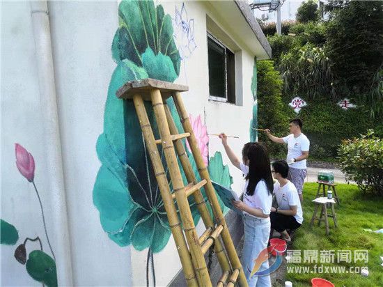 為保證墻繪質(zhì)量與進(jìn)度,每天早上6點(diǎn)鐘,實踐團(tuán)成員們就拿著顏料、畫筆、水桶等工具開始創(chuàng)作。炎炎夏日,腳手架上忙碌著的身影成為了一道靚麗的風(fēng)景線。為了讓實踐團(tuán)能夠全身心投入到創(chuàng)作當(dāng)中,疊石鄉(xiāng)團(tuán)委聯(lián)合竹陽村團(tuán)支部為實踐團(tuán)師生提供了良好的后勤保障。