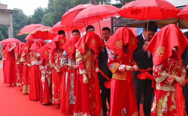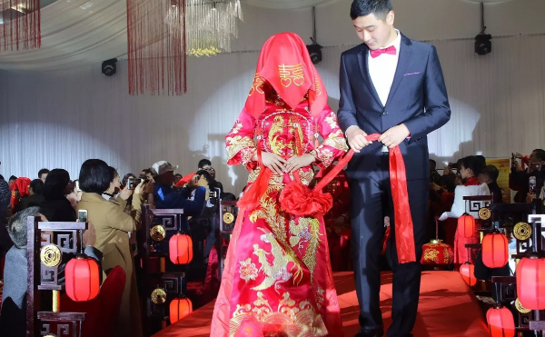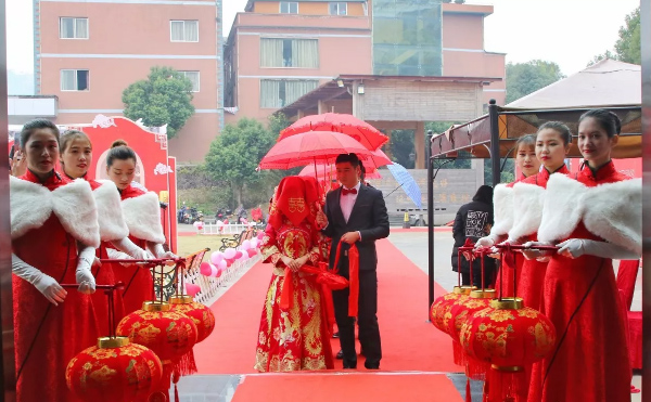 據(jù)了解,此次婚禮全程采用中式嫁娶習(xí)俗,新娘頭蓋紅蓋頭,新人手拿紅繡球,跨火盆、跨馬鞍等婚禮流程與傳統(tǒng)中式儀式相同。在活動之中,還在新人之間進行抽獎活動,一、二、三等獎獎品分別為價值不等的旅游券。