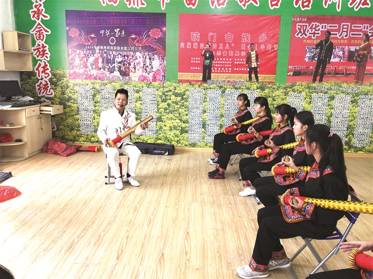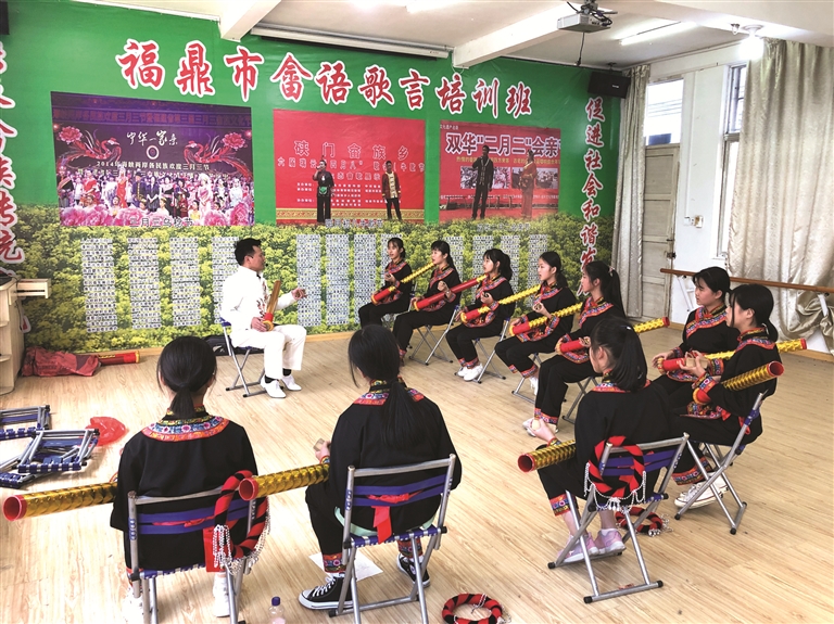 在嘭嘭鼓說(shuō)唱藝人林祥本的帶領(lǐng)下,十名身著畬族服飾的初一女生,有板有眼地跟唱《十二月采茶詩(shī)》。只見(jiàn)她們右手擊鼓,發(fā)出嘭嘭的鼓聲;左手持板,發(fā)出噠噠的竹板聲。采茶故事就在鼓聲和竹板聲的輕快節(jié)奏中娓娓道來(lái)。