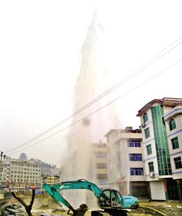 昨日上午8時(shí)左右,福鼎市區(qū)龍山中路“白改黑”拓寬改造工程項(xiàng)目工地上,一條地下供水管道被鉤機(jī)砸破,地下瞬間噴射出了約30米高的水柱。福鼎市自來(lái)水有限公司接到搶修電話后,通過(guò)約1小時(shí)的搶修,恢復(fù)了正常供水。