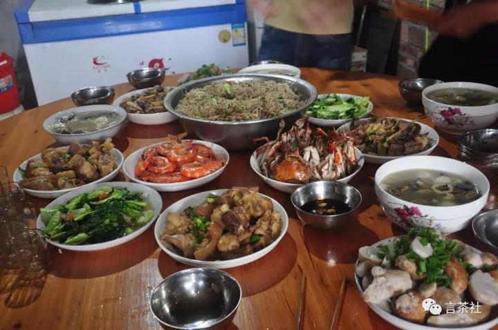 觀賞完茶山,川哥豪爽好客,一桌美食早已準備就緒。有山里的有機菜,有機芋頭,土雞,海鮮等等,大魚大肉,大盤大菜。