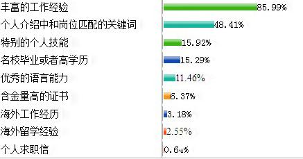 前程無憂論壇“HR聚會所”部落就“簡歷中最能打動HR的因素”發(fā)起了網(wǎng)上調(diào)查,調(diào)查結(jié)果顯示,“豐富的工作經(jīng)驗(yàn)”以遙遙領(lǐng)先的百分比不出意外地成為HR最為看重的簡歷中因素。排在第二位的是“個(gè)人簡介中和崗位匹配的關(guān)鍵詞”,排在第三位的是“特別的個(gè)人技能”,“名?;蛘吒邔W(xué)歷”緊隨其后,排在第五位的是“優(yōu)秀的語言能力”。